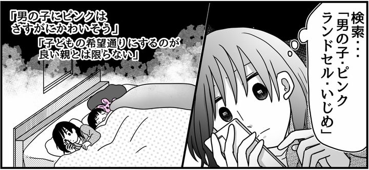 ネットで「男の子のピンクはいじめられる」といった言葉を検索し、アヤトの選択を阻止するべきか悩んでいました。