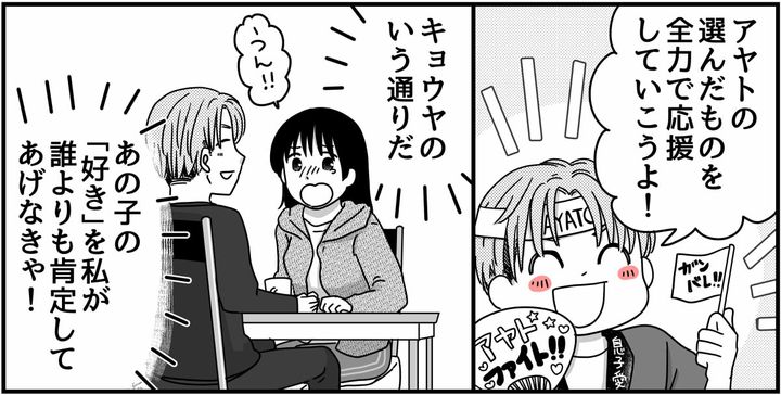 キョウヤの「全力で正解にしていこう」という言葉に勇気をもらい、私が誰よりもアヤトの感性を肯定する最強の応援団になろうと決意しました。