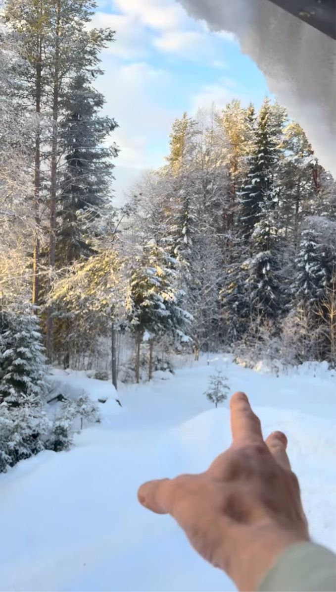 なんと、窓を覆っていた雪が一気に崩れ落ち、美しい森の風景が現れました!!! 窓を覆う高さまで雪が積もっているのかと思いきや、屋根から薄い雪が壁のように垂れ下がっていたようです。