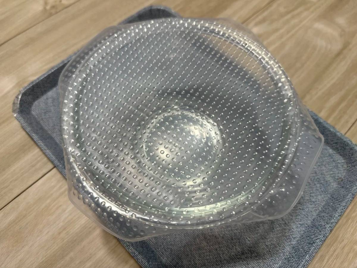 凸面を上にしてシリコンラップを伸ばし、容器の縁を合わせてかぶせればOK♪