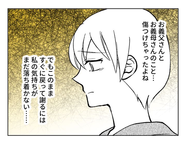 家を飛び出して泣きながら運転しているうち、冷静になってきたフミカさん。義両親を傷つけるような行動をしてしまったことを、少しずつ後悔しはじめたようです。しかしこのまま帰るにはまだ気持ちが落ちつかないため、近くに住むお友達の家にお邪魔することに。お友達にお話を聞いてもらって、自分の心が整理できるといいですね。