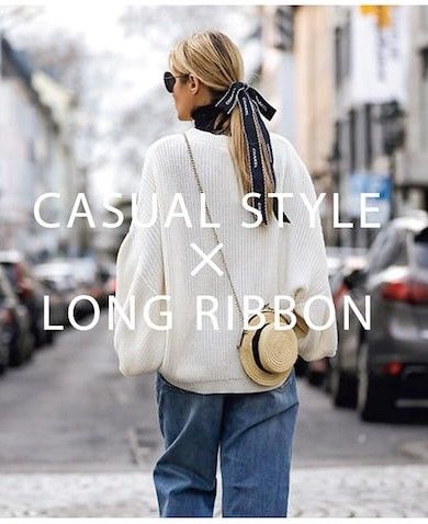 「ラフな装いに低めのポニーってやぼったく見えがちだけど、「リボンを長めにたらすことで、あえてのやぼったさに変換される」から不思議。リボンはカジュアルな服を抜けさせる万能アイテムだから1つ持っておくと便利です」(スガタクマさん・ヘアメイク)