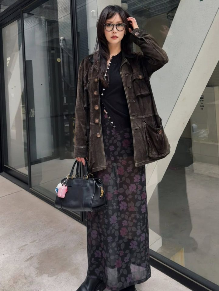 「今期はシースルーやレース、サテンなど女性らしいファブリックが気になっていて、花柄のシースルースカートを取り入れて春らしくスタイリングしました。甘くなり過ぎないようにスエードとレザーの古着アウターを羽織ってカジュアルダウンしたところもポイントです」