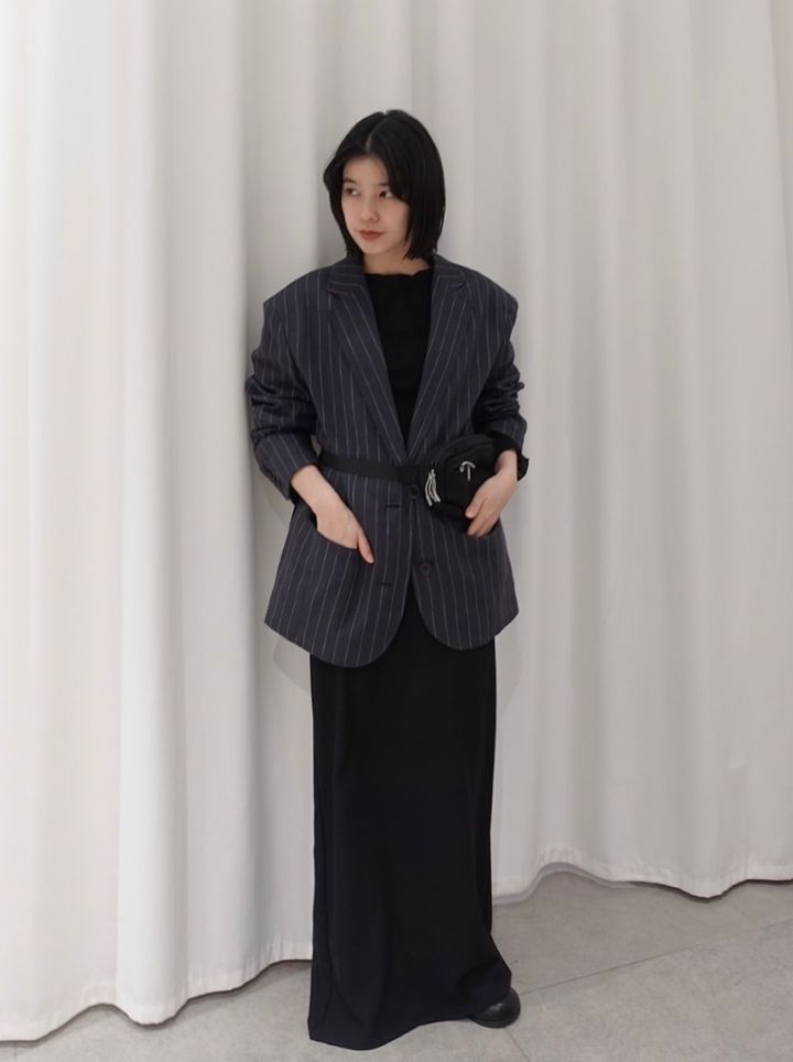 「全体的にダークトーンでまとめ、モードな雰囲気のコーディネートを意識しました。低身長なので、オーバーサイズのジャケットはウエストポーチでアクセントをつけてバランスを意識しています」