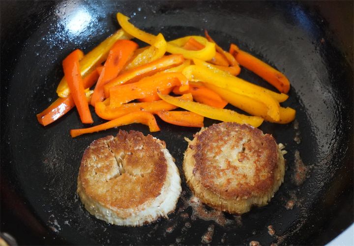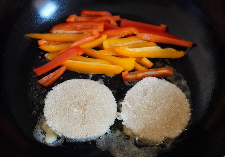 えのきたけはバラつかないようにそっと裏返し、ミニパプリカは軽く炒めます。