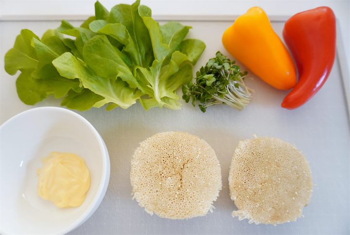 野菜はパプリカ、ピーマン、サラダ菜、ブロッコリースプラウト、かいわれダイコンなど、お好みで準備してくださいね。