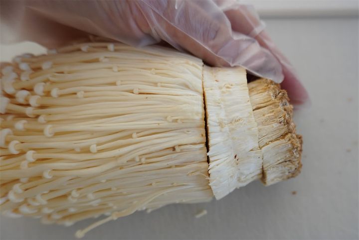 切り方のコツは、石づきのおがくずが付いた部分を根元ギリギリ、1cmほどを目安に切り落とすことです。このおがくずが付いた部分は食べられないのでご注意を!