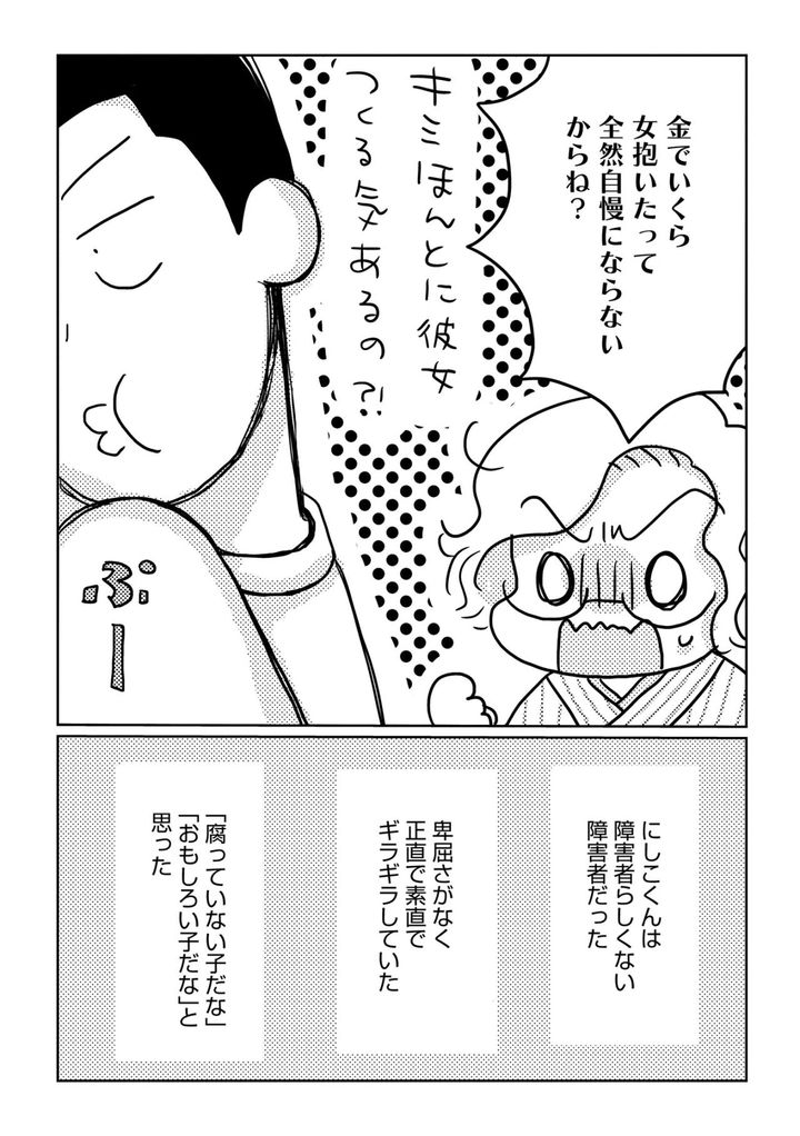 漫画家と雑貨屋を営むにしけ婦人。夫と重度の知的障害のある息子・くーちゃんとの3人家族。自分はそれなりに幸せだと思っていたところへある日、「にしこ」と名乗る障害を持った青年が現れ、人生の歯車が突如大きく狂いだすことに…!?46歳女性漫画家のストレートな感情を描く、衝撃の不倫コミックエッセイ『46歳漫画家、20歳年下の障害者と不倫して再婚しました。』がゆうゆうtimeでも連載スタート!