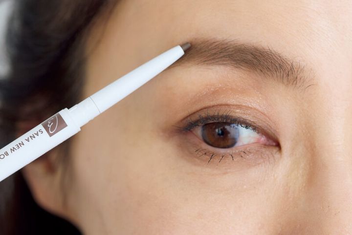 (左)自眉の黒っぽさを抑え、さりげなくやわらかい印象に見せるダークグレージュ。