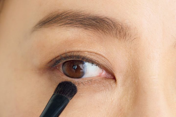 下まぶたには細めにのせたいのでブラシを使って。