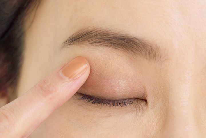 上まぶたの際からアイホールまで、ツヤのあるブラウンを指でつけて密着させる。