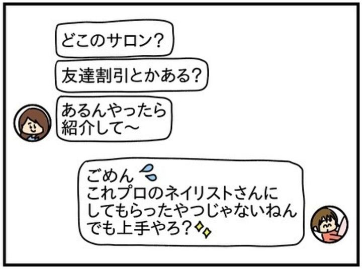 ある日、中学生の姪っ子にしてもらったネイルをSNSにアップした きよかさん。すると、学生時代の友人・チコちゃんから「このサロンを紹介して欲しい」というDMが届きます。そして、相手が中学生だと分かると「練習台になってあげる」と、突然の上から目線…。