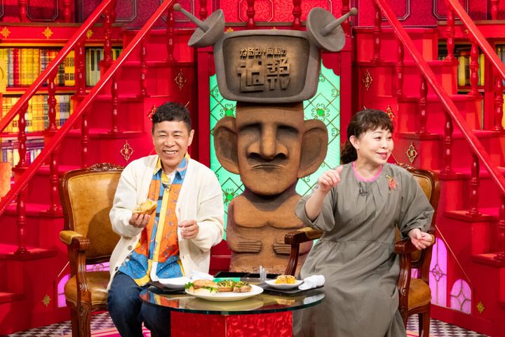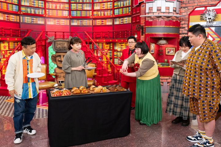 スタジオには各店から全14種類のクロワッサンが登場。トングを持つなるみと岡村に、パンタジスタたちが猛アピールする!
