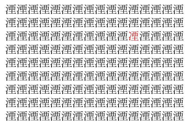 画像の中には、「湮」という漢字が縦に9行、横に16個並んでいます。 全部で144個となりますが・・・、そのうち1つは「異なる漢字」となってますよ!!