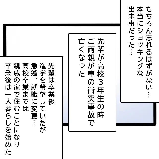 みずほ先輩は高校3年生の時にご両親を事故で同時に亡くしたのです。そのため、高校卒業までは親戚の家に住み、卒業と同時に一人暮らしを始めました。成績優秀で進学予定だったみずほ先輩でしたが、急遽、進学を諦めて就職することになったのです。