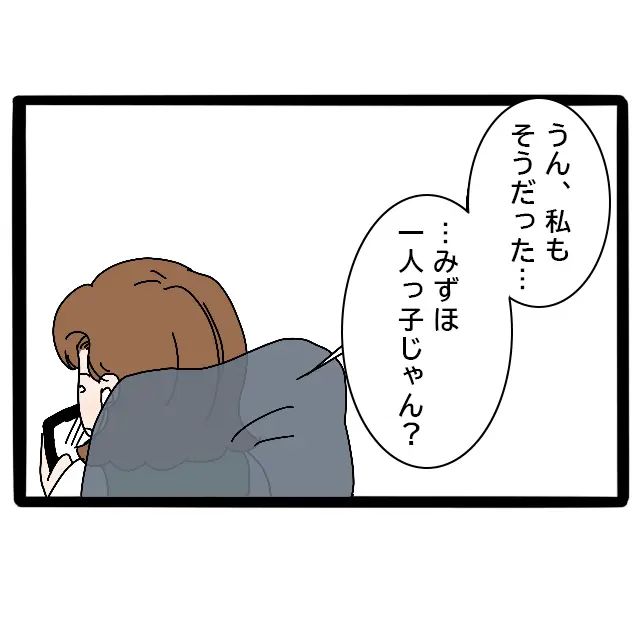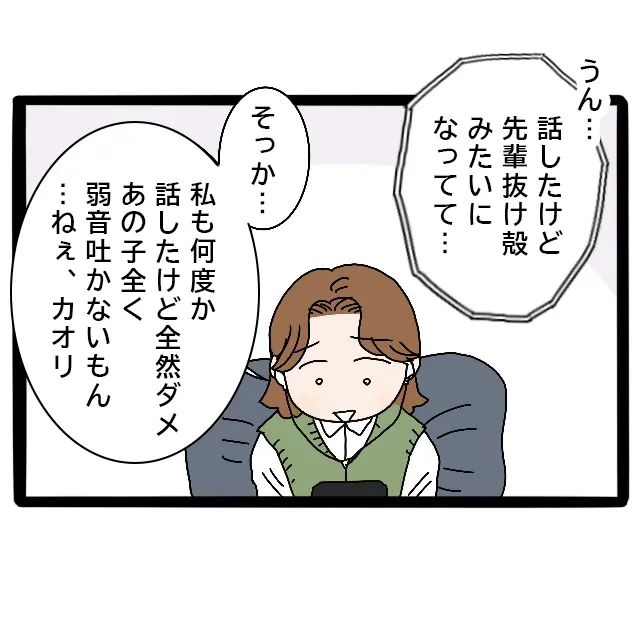 隆明さんと婚約したカオリさんは、家族への報告のため久しぶりに電車で2時間と少し距離のある実家に帰ることにしました。まずは義姉でもあり、高校バレー部の先輩でもあるみずほさんへメッセージで婚約を報告したカオリさんは、いつものように明るく大喜びの返信がくると期待して待ってましたが、翌日になって届いた返信は他人行儀に「おめでとうございます」とひと言。違和感を覚えましたが、半年前に初めての子つむぎちゃんを出産したばかりのみずほさんは忙しいか疲れているのかなと深くは考えていませんでした。ところが実家に帰ってみると、いつも明るくニコニコして大好きだった母親が嫁であるみずほさんを執拗にいびっているのを目撃してショックを受けたのでした。もちろん母親に物申してもいじめの自覚が全くない母親、そして兄は妻が心身ともにつらい目に合っていると言うのに知らん顔です。みずほ先輩と話そうとしても、カオリさんに庇ってもらったら余計につらく当たられる、更にはつむぎちゃんを取られて自分だけ追い出されるのではないかと怯えているみずほ先輩に愕然としました。大好きだった実家が変わってしまったことに動揺したカオリさんでしたが、何もできずに逃げるように帰宅しました。そしてすぐに従姉で高校バレー部の先輩でもあるよっちゃんに電話をかけて、実家の様子がおかしいと打ち明けると、よっちゃんは何か原因を知っているようでした。