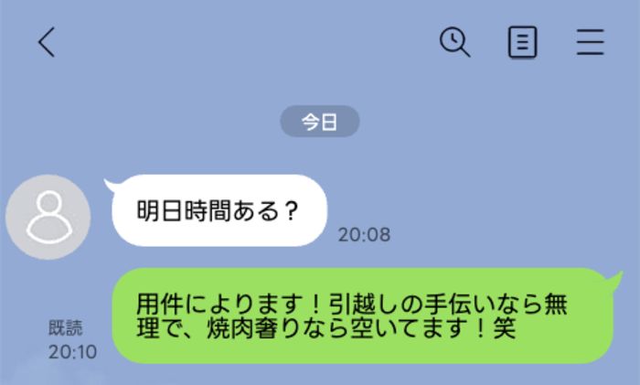 「用件によります!引越しの手伝いなら無理で、焼肉奢りなら空いてます!笑」
