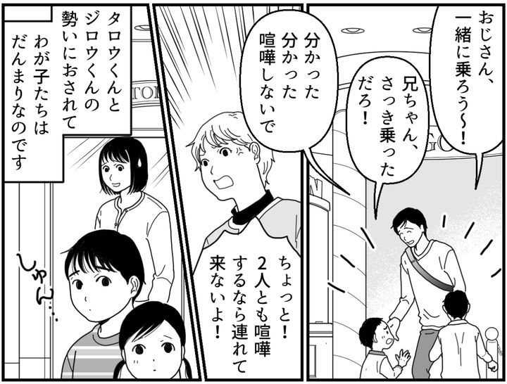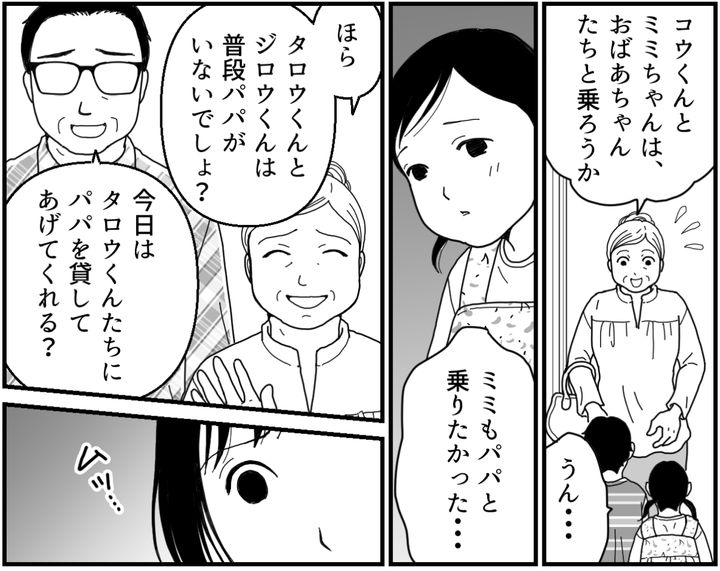 夫は子どもの相手が上手です。一緒に出かけると甥っ子たちは、こぞって夫を取り合います。おとなしいウチの子たちは、どうしてもその勢いにおされてしまい……。大好きなパパを取られてしょんぼりしているのです。