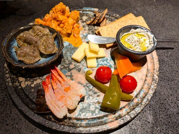 前菜盛り合わせ 1490円~。 明太子と長芋のポテトサラダ・グリュイエールチーズ(スイスの女王様)・しらすとクリームチーズ・スパイスたっぷりのピクルス・甘エビの白ワイン昆布締め・砂肝のコンフィ・干しバナナです。