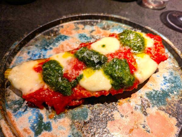 ナス生地のピッツァ・マルゲリータ風 1190円 ピザ生地ではなく、ナス生地のマルゲリータ。熱々ホクホクのナスの上にとろ~りチーズ!おいしいです。