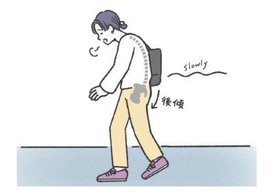 骨盤が後ろに倒れていると、足は素早く前に踏み出せず、歩くスピードが遅くなり、消費カロリーも減少します。また、無駄に力を使って足を前に出すことになるので、非常に疲れやすくなり、歩くことがおっくうになってしまうのです。