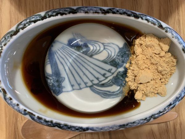 透明で絶妙なやわらかさの寒天餅を、黒蜜ときなこにからめていただきます。 とても優雅な心持ちになります。