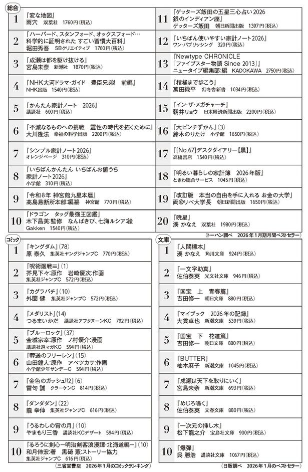 1月14日に芥川賞・直木賞が発表されたが、受賞が決まった3作はベスト20にまだ登場していない。ただし文芸書は『変な地図』『成瀬は都を駆け抜ける』『イン・ザ・メガチャーチ』『暁星』の4点がランクインした。正月は小説を読んで過ごした人も多かったのではないだろうか。