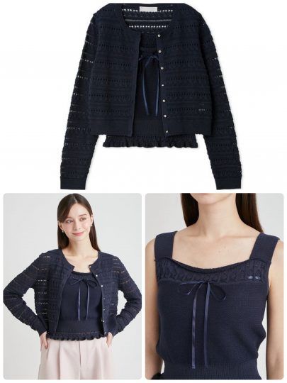 透かし編みのニットアンサンブルは、さり気なく光沢感のある糸を使用。カーディガンはボーダー調に柄を組み合わせ、インナーの身頃は透けないメッシュ編み。襟元に通したリボンも同色ネイビーだから、可愛くなり過ぎず安心です。
