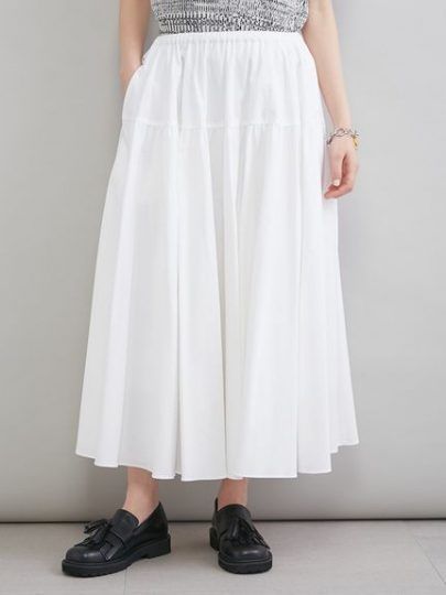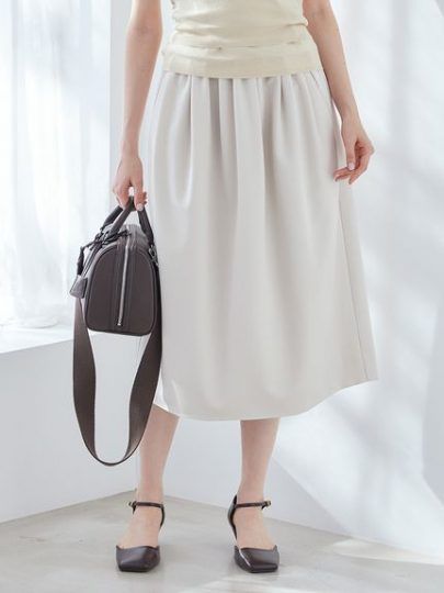 ウエストに構築的なゴムギャザーをあしらったスカート。ハリのあるツイル調の素材がきれいめな印象で、膝が隠れるくらいの長さが上品。ウエストはぐるりゴムながらベルトループ付きだから、ウエストマークして履いていただくのもおすすめ。