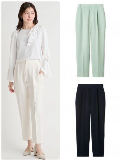 毎シーズン人気の美脚見えテーパードパンツ。ほんのり艶感と適度な厚みがありながらも軽やかで、程よいストレッチ性のある素材を採用。足首が見えるすっきりした丈感で、パンプスにもスニーカーにも合わせやすくオンオフで活用できます。