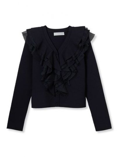 顔まわりを華やかに演出するフリルは、チュールを重ねることで奥行きのあるデザインに。身頃はリブ編みで伸縮性抜群。ボタンをすべて閉めてトップスとして着用しても可愛いシルエットです。