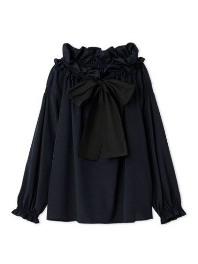 細かいドット柄と上品な光沢のある薄手素材を使用したブラウス。襟ぐりにふんだんにあしらったフリルとタフタ素材のビッグリボンが顔回りを華やかに演出。前後着用が可能なデザインだから、その日の気分に合わせて楽しめます。