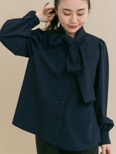 ボウタイまわりにレースををトリミングした、甘すぎず大人でも取り入れやすいバランスが魅力。素材にはとろみのあるシャツ地を採用し、きれいめな印象を演出。ボウタイはリボン結び・片結び・ラフに垂らすなどアレンジ自在で、TPOに合わせて印象を変えられます。
