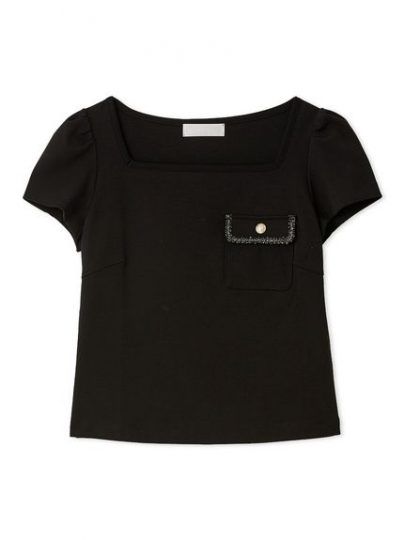 ほどよい開きのスクエアネックのカットソートップス。身頃はより伸縮性のあるフライス生地で着心地は抜群。左胸にはフラップ付きのポケットを付けてツイードジャケットなので使われるブレードリボンをあしらい、メタル釦をオン。