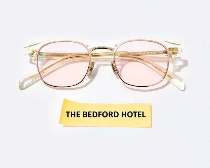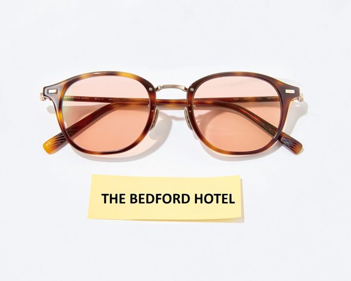 細めのべっ甲柄のフレーム×ピンクのレンズで、シンプルながら目元を華やかに。¥23,100/ザ ベッドフォード ホテル(キングスター)
