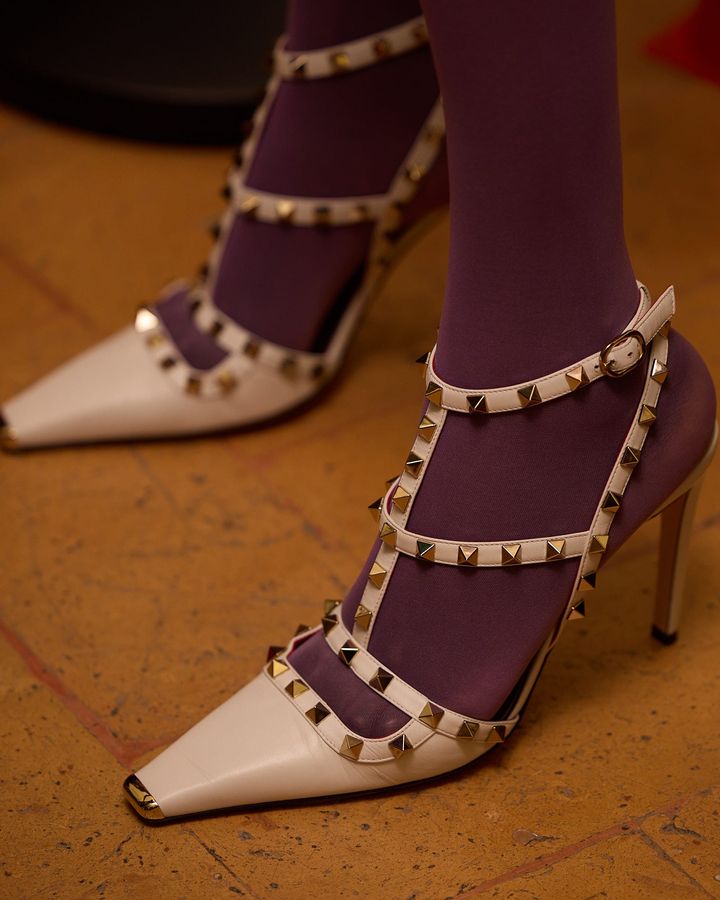 コレクションにモダニティを添えているのは⼩物で、ヒールがメタリックのバイカラーシューズや、アイコニックなロックスタッズのシューズ、フューチャリスティックなシールドグラス、アーカイブからインスパイアされた数々の⼤ぶりのジュエリーが華やぎを演出。