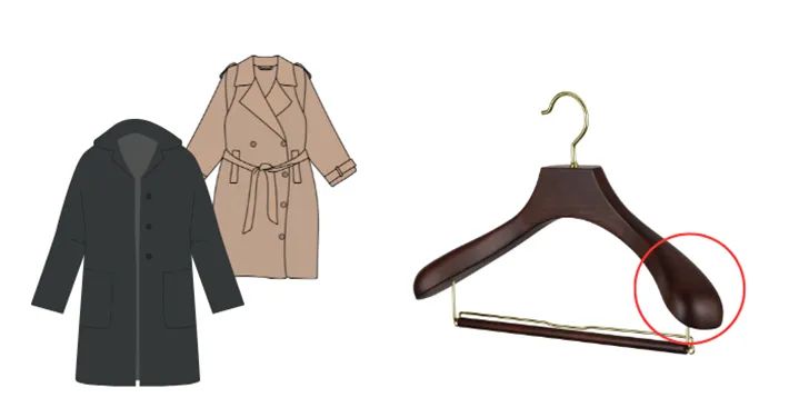 コート・アウターは重みがあるため、肩の厚いハンガーでしっかり支えることが重要です。