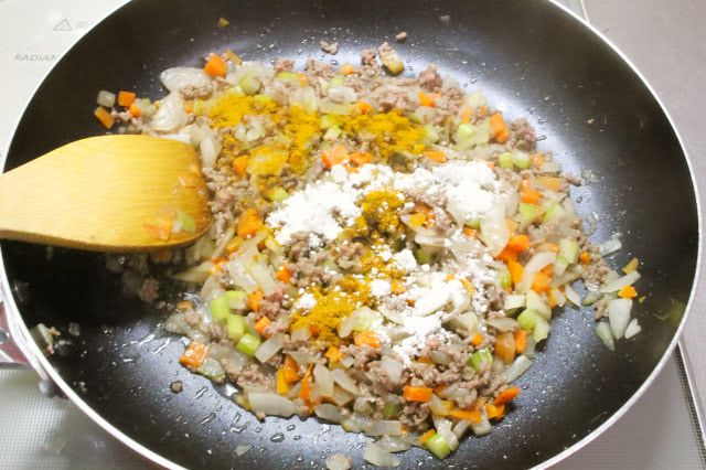 ひき肉の色が変わったところでカレー粉と薄力粉を加え、粉っぽさがなくなるまで30秒ほど炒めました。