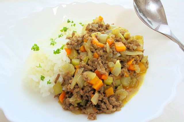 料理研究家・上田淳子さんのレシピで作った「ドライカレー」がこちらです。市販のルウではなく、カレー粉と薄力粉を使ったので、炒めたひき肉をご飯にかけたような見た目です。