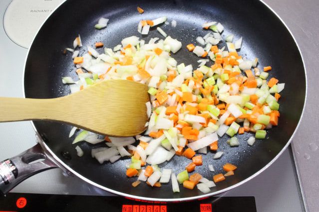 2. サラダ油を引いたフライパンを中火で熱し、1の玉ねぎ、にんじん、セロリに油が回る程度にサッと炒めます。