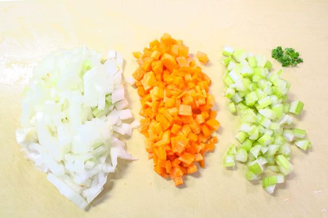1. 玉ねぎ、にんじん、セロリ、パセリをみじん切りにします。
