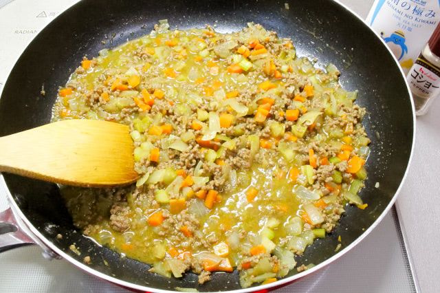 ひき肉、しょうが、にんにくを加えて2分ほど炒めると、ひき肉の色が変わりました。セロリの香りがひき肉の臭み消しにも役立っているようです。
