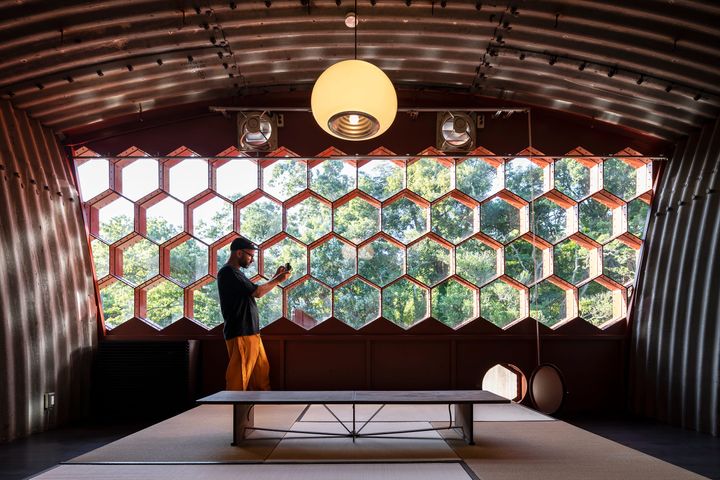 <写真>六角形の部材を連ねたハニカム構造の窓が印象的な内部空間。高い構造強度を保ちながら光を取り込み、幾何学的な陰影が室内に独特のリズムを生み出している。
