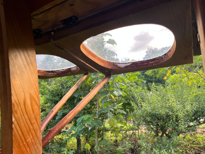 <写真>宙に浮く茶室の内部。小さな窓からは、信州の象徴である八ヶ岳を一望できる。