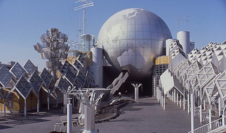 藤沢市湘南台に位置する「湘南台文化センター」は、平成元年に誕生した。最大の特徴は、地球儀と宇宙儀を模した2つの巨大なドームだ。小径や橋、せせらぎといった外部空間のオブジェは一貫した世界観のもとに配置され、建築と宇宙の融合が試みられている。建物の約70%が地下に構成されたその特異な全容は、まさに“小宇宙を乗せた船”。直径37mのジオデシックドームや吊り下げ構造を採用した球体など、高度な構造設計が未来的な風景を創出している。