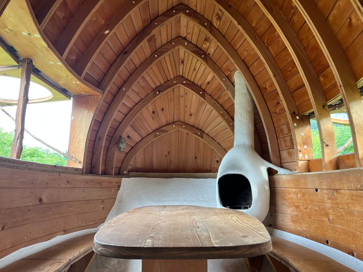地元の職人やワークショップの参加者と共に作り上げられたこの建築には、手仕事の温もりと藤森建築特有の素材へのこだわりが息づいている。泥のテクスチャーや、雨対策として施された銅板のしつらえは、周囲の風景と静かに、けれど大胆に響き合う。普段は内部を公開していないが、特別なプロジェクトを通して茶室の内部に入れる体験も用意されている。