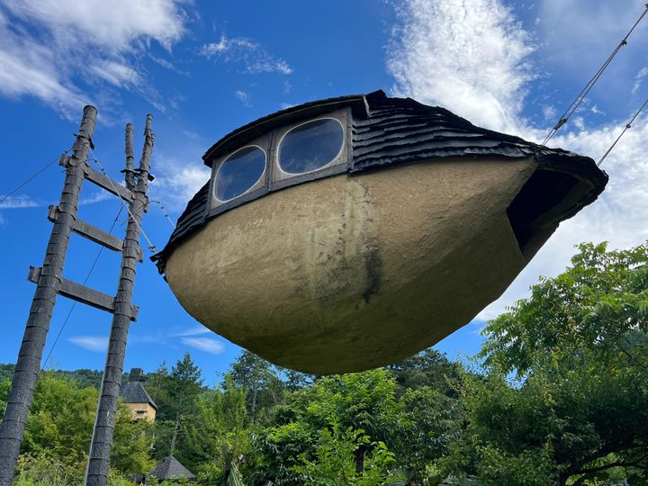 信州・茅野市ののどかな風景の中に突如現れる、藤森照信設計の「空飛ぶ泥舟」。4本のワイヤーで吊り下げられ、地上約3.5mにふわふわと浮かぶその姿は、まさに名が示す通り、泥を纏った舟が宙を漂うかのような独創的な茶室だ。同じく藤森照信設計の世界一危険とも評される「高過庵」や、地下に埋まったピラミッドのような「低過庵」と共に、藤森の故郷に点在する茶室群のひとつとして、訪れる者に強烈なインパクトを与える。