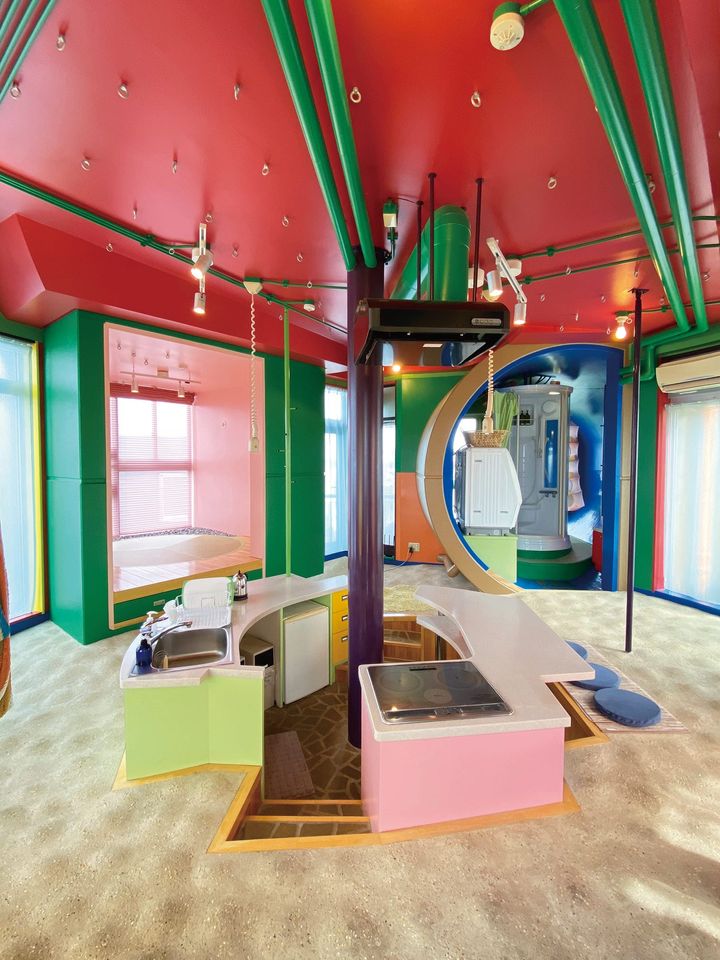 荒川修作とマドリン・ギンズが長年の研究を経て構築した「三鷹天命反転住宅」は、東京西郊外で異彩を放つ。瀬戸内寂聴が“極彩色の死なない家”と称した通り、内外装を彩る14色の色彩と、一つとして同じものがない9つの住戸が特徴だ。ここは単なる住居ではなく、身体が中心となるよう設計された実験的な環境。日常を過ごす場所を捉え直すことで、人間の潜在的な感覚を呼び覚ます“死なないための家”として、建築界や芸術界に大きな衝撃を与え続けている。