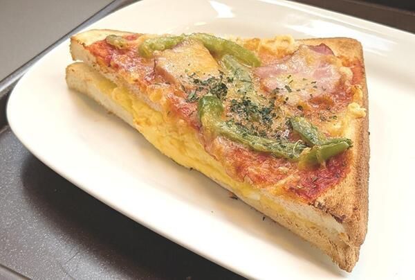 ふわふわのやわらかなトーストにたまごサラダを挟み、天面にバジルの風味とトマトの酸味が効いたピザソース、燻しベーコン、ピーマン、3種のチーズをトッピングした食べ応えのあるピザ&たまごサンドです。