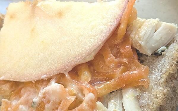 風味豊かな食パンに、タイムとレモンが香るジューシーなチキンのフィリング、シナモンとはちみつでマリネしたキャロットラペ、フレッシュなりんごのスライス、そしてゴーダチーズをサンドしたものです。濃厚かつクリーミーなトマトスープをつけながら楽しめます。